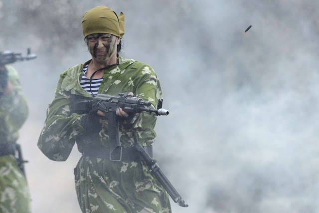 A young Ukrainian soldier poses at a checkpoint on a road near the eastern city of Artyomovsk in Ukraine on Sept. 24, 2014.